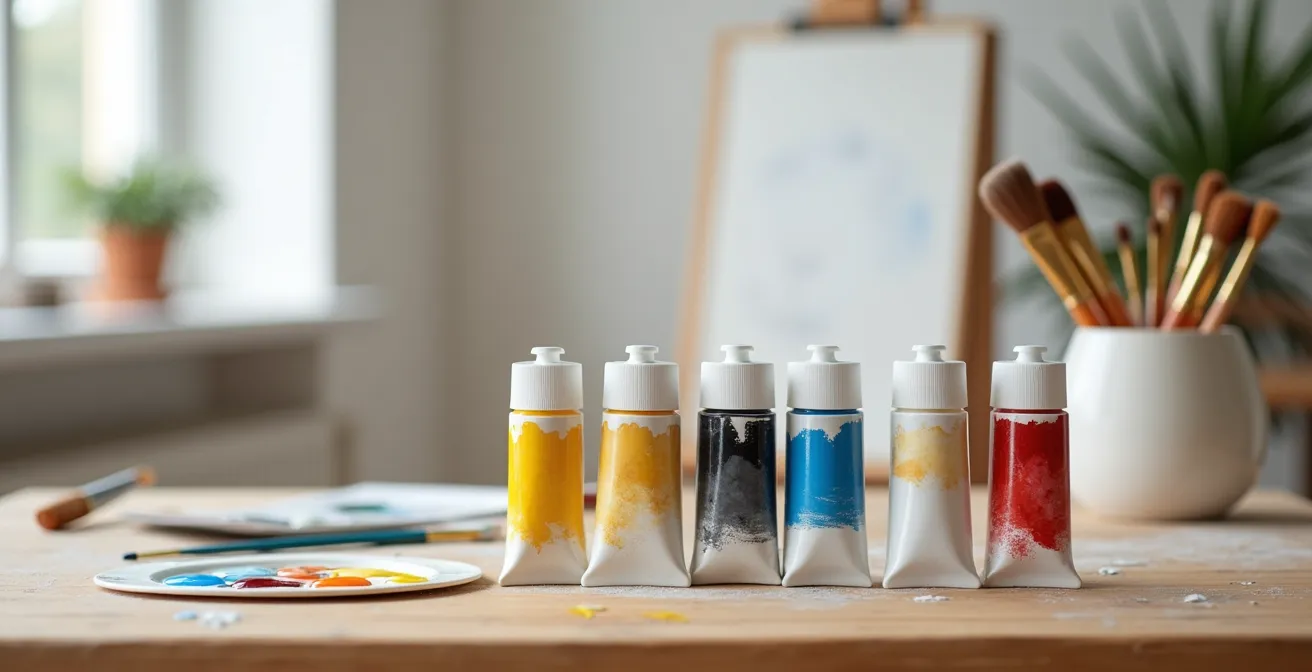 Die Farbenindustrie ist ein riesiges Geschäft, das von der Idee lebt, dass für jede Nuance eine eigene Tube nötig ist. Allein in Deutschland wurden 2023 Farben und Lacke im Wert von über 6 Milliarden Euro verkauft. Doch dieser Überfluss ist für einen Anfänger keine Hilfe, sondern eine Falle. Anstatt ein Set mit 24 schwach pigmentierten Farben zu kaufen, von denen Sie 20 nie benutzen, investieren Sie in fünf hochwertige Tuben. Das ist keine Einschränkung, sondern ein mächtiges System. Die sogenannte erweiterte Zorn-Palette, benannt nach dem schwedischen Maler Anders Zorn, ist der perfekte Startpunkt.